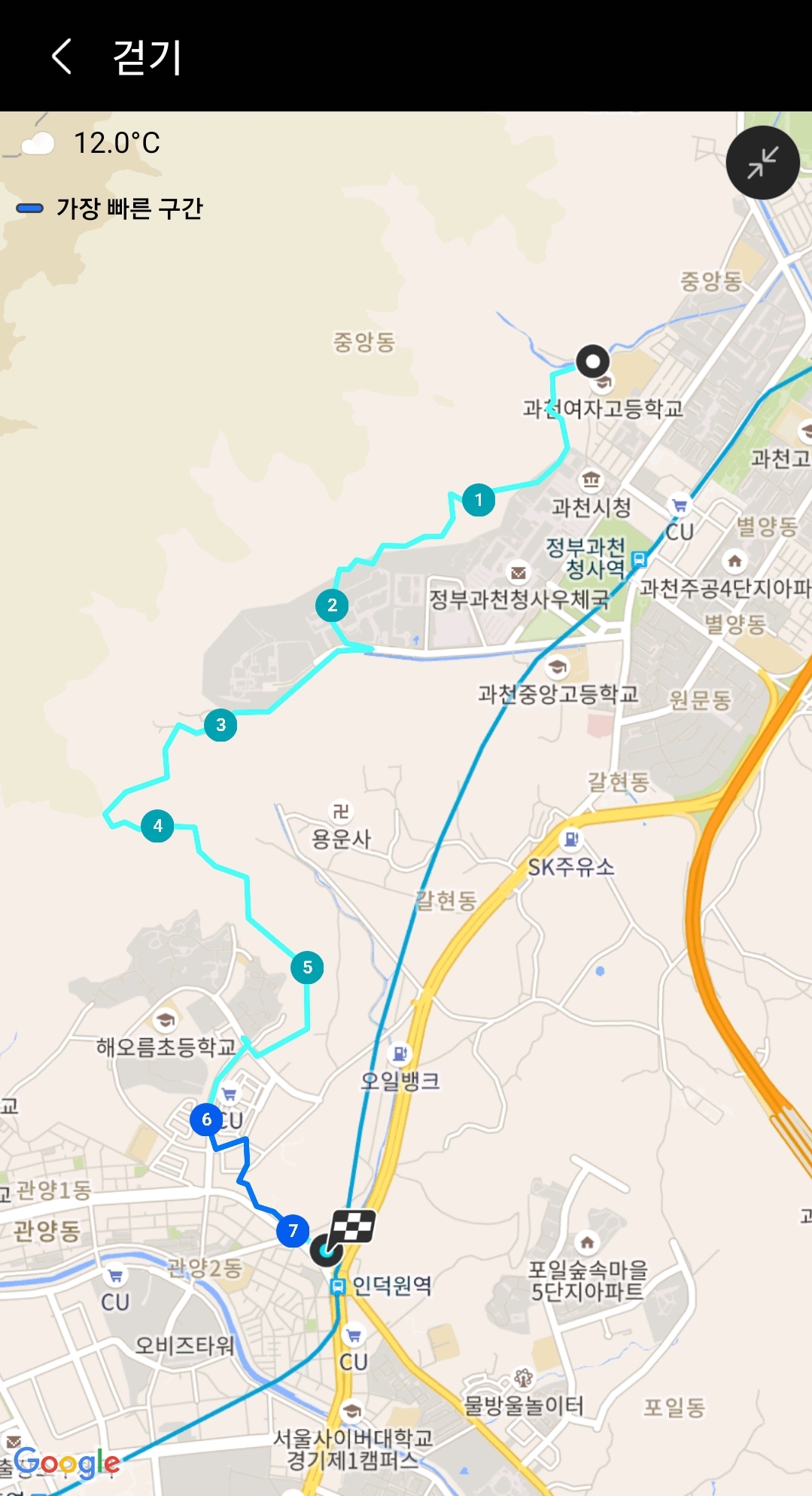 최근 과천향교에서 인덕원역까지 관악산 둘레길을 따라 걸었어요. 이 둘레길은 산 중턱보다도 낮은 곳에 있어서 단풍 뷰가 그렇게 편하지 않습니다. 하지만 숲 속을 걷기에 몸안으로 들어오는 공기 신선도는 아주 편하답니다. 제가 그날 걸은 걷기 경로는 [아래 사진]과 같습니다.
