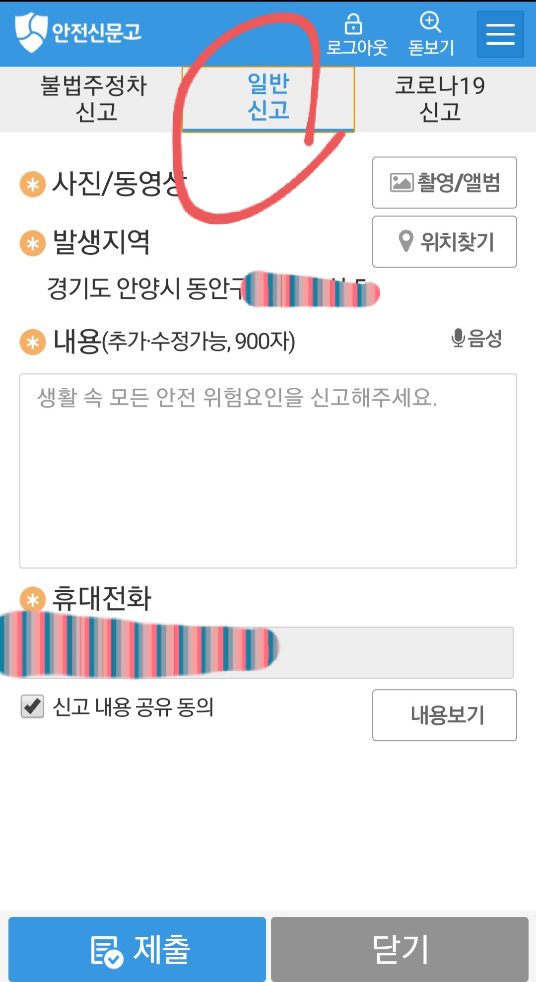 신고 카테고리는 불법 주정차 신고, 일반신고, 코로나 19 신고 등 3개입니다. 철근이 노출된 전봇대 처리는 위험 요인 신고이므로 "일반신고"를 선택합니다.