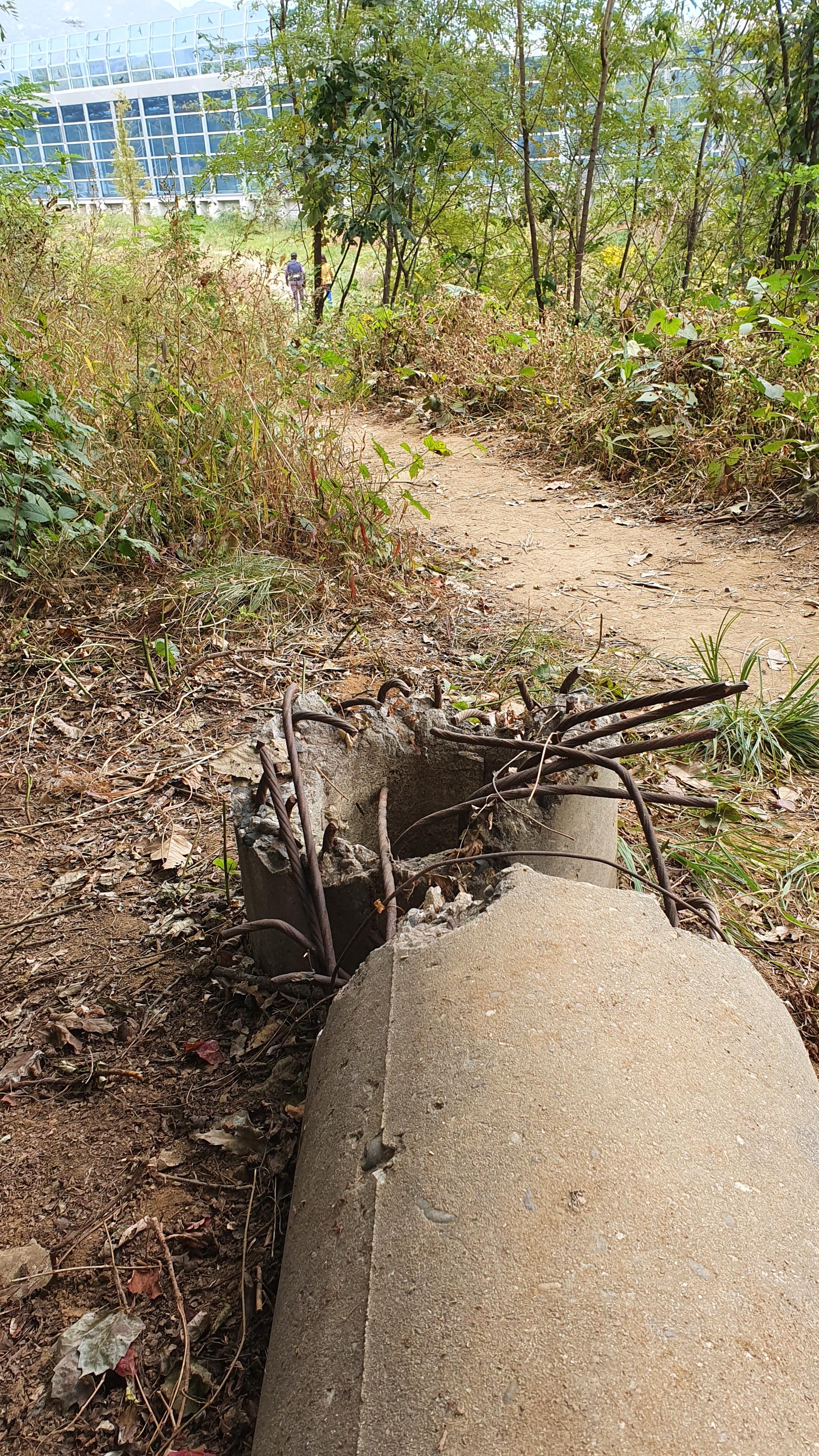 그런데요. 걷다 보니 산책로 옆에 [아래사진]과 같이 철근이 노출된 전봇대가 쓰러져 있더군요. 그냥 지나치려 했는데 자꾸만 위험 요인이 신경 쓰이더군요. 그래서 안전 신문고에 신고하려고 사진 촬영을 했습니다.