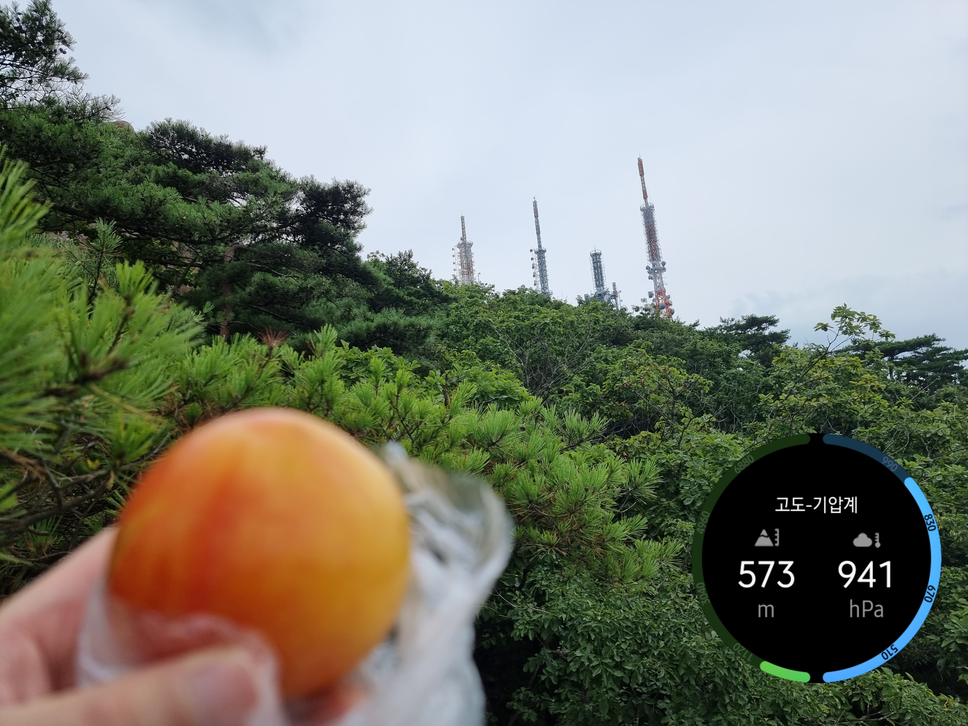 땀을 많이 흘렸습니다. 휴식 취하면서 간식으로 가져온 과일 먹으면서 사진촬영과 그리고 고도-기압계 화면을 캡처해서 [아래 사진]과 같이 위와 같이 편집합니다.