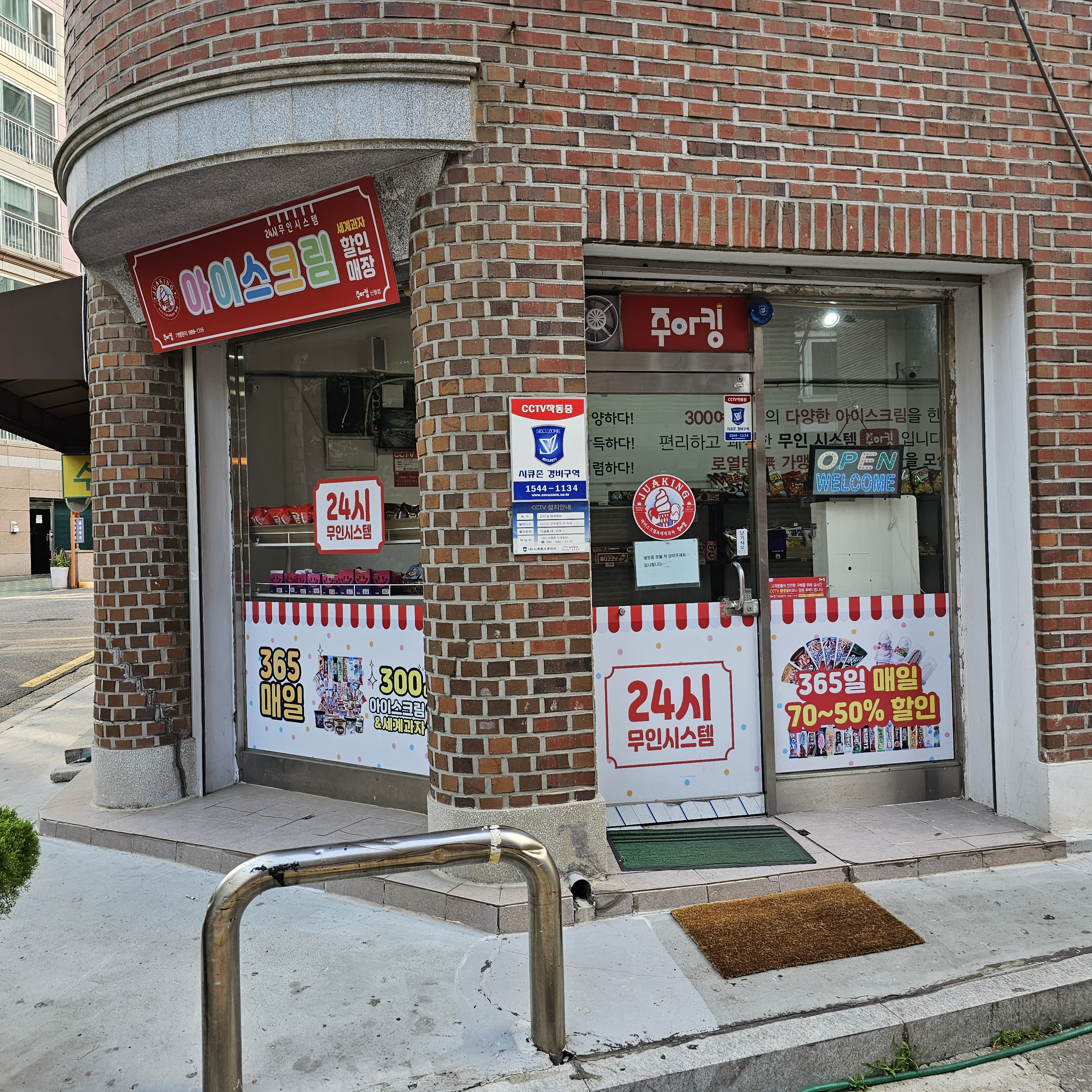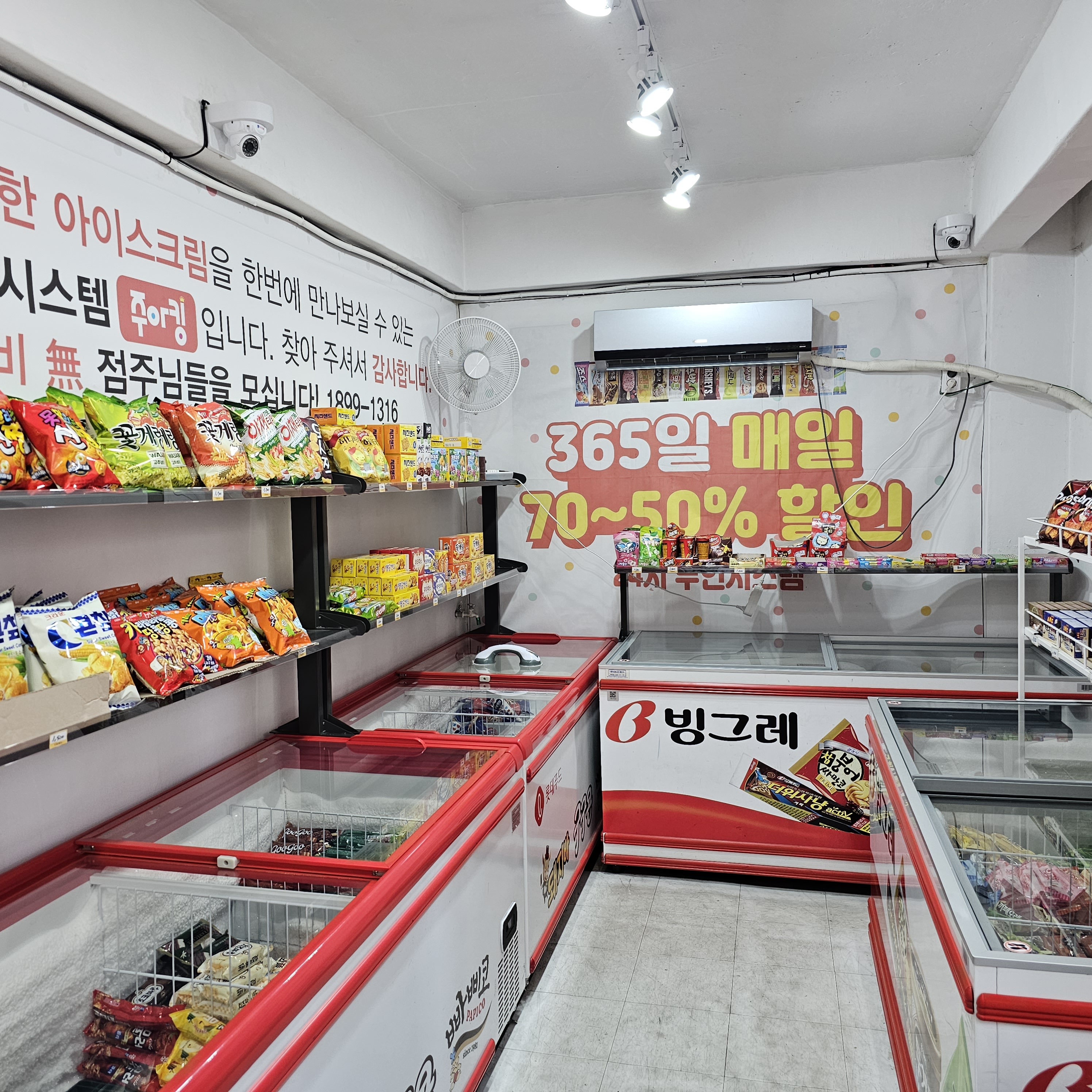 입간판에 24시간 무인시스템으로 아이스크림과 세계과자 할인매장이라고 안내되어 있습니다. 그리고 365일 매일 70-50% 할인이라는 안내문도 외벽유리에 붙어 있네요.